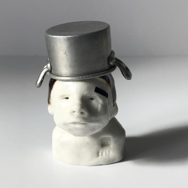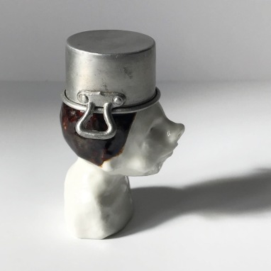 skulptur i glaseret porcelæn, miniature gryde og gaffatape