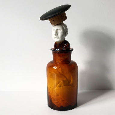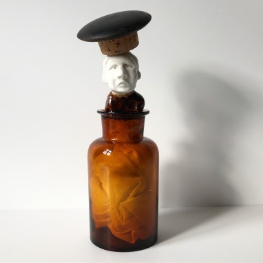 skulptur i glaseret porcelæn, glasflaske med træ/korklåg og gazestof