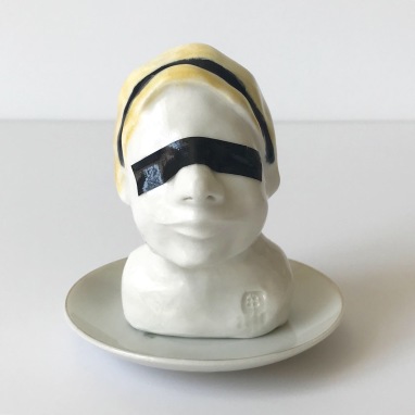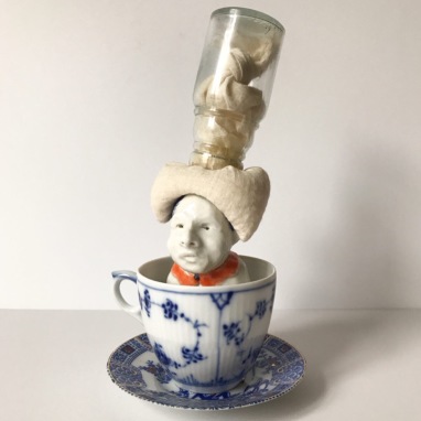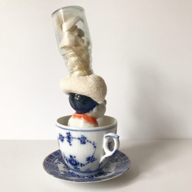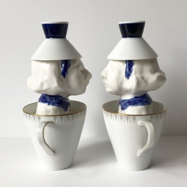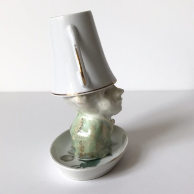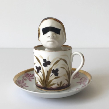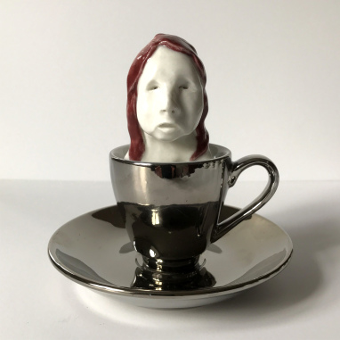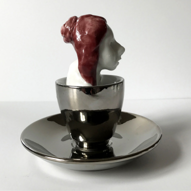 skulptur i glaseret porcelæn, kaffekop og miniplatte