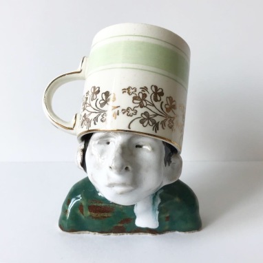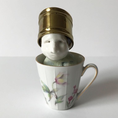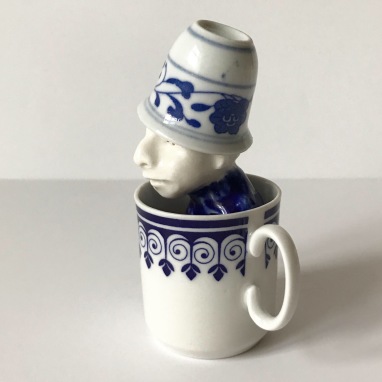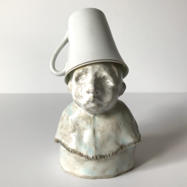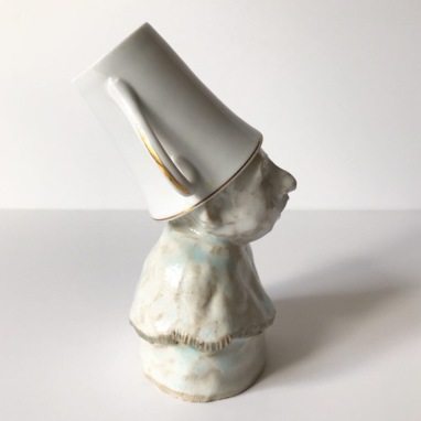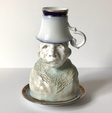 skulptur i glaseret stentøj og kaffekop