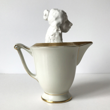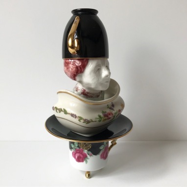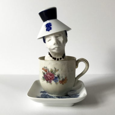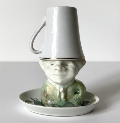 skulptur i glaseret porcelæn, kaffekop og fotografiudklip