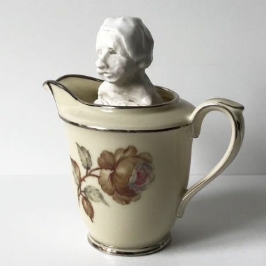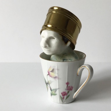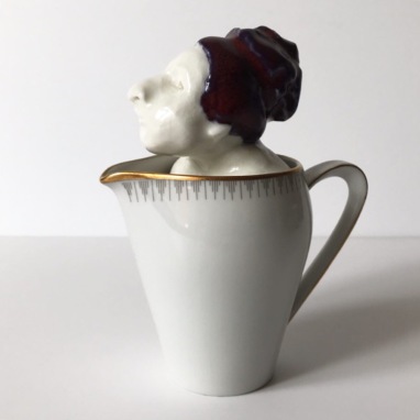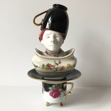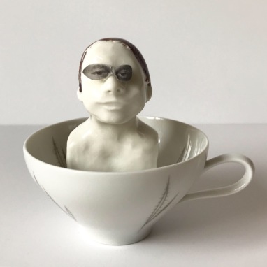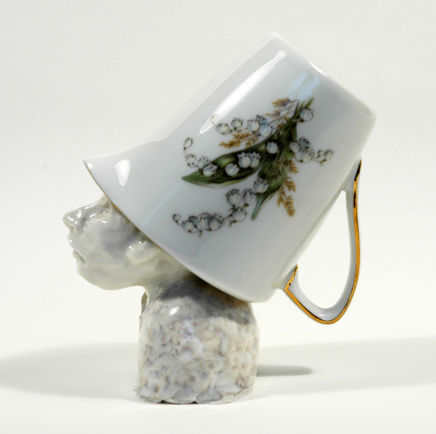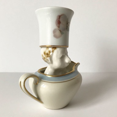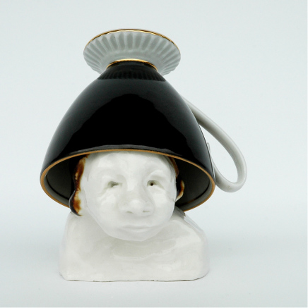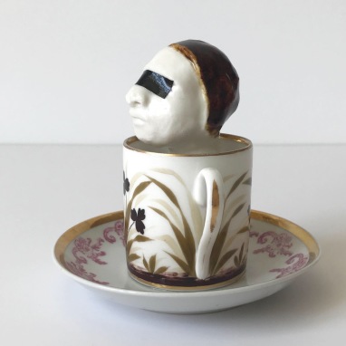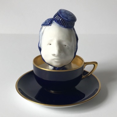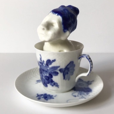 skulptur i glaseret porcelæn og kaffekop