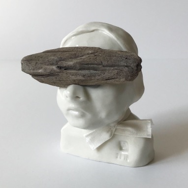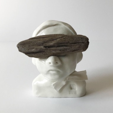 skulptur i glaseret porcelæn, drivtømmer og thaisilkebånd