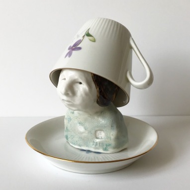 skulptur i glaseret stentøj, kaffekop og underkop