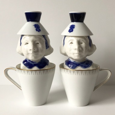 skulptur i glaseret porcelæn, kaffekop og sakekop